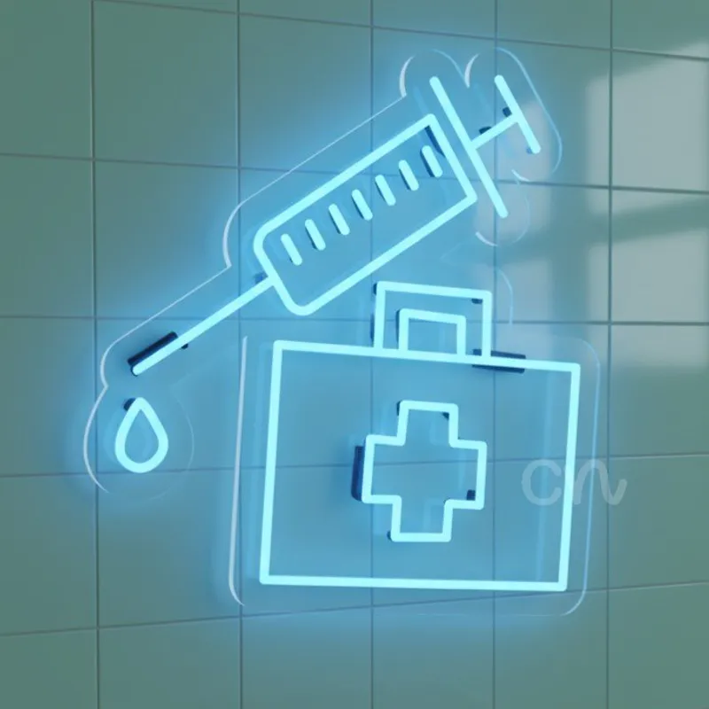 Bring a professional yet stylish touch to your medical space with this custom LED neon sign featuring a syringe with droplet and a first-aid kit design, crafted in a clean blue glow. Sized at 20x19, this sign is designed to stand out without overpowering the space, making it ideal for clinics, pharmacies, first-aid stations, or healthcare-themed interiors. The modern LED tubing ensures energy efficiency and a long lifespan, offering vibrant light with minimal heat output. The design combines clarity with simplicity, ensuring it is easily recognizable and delivers an impactful message of health and care. Mounted on a sturdy backing, this piece can be displayed seamlessly on walls to enhance visibility while maintaining a professional atmosphere. Its durable construction makes it suitable for long-term use, while the bright blue illumination adds both a functional and decorative element. Perfect for reception areas, waiting rooms, hospital corridors, or personal spaces dedicated to medical professions, this neon sign creates an inviting and trustworthy impression. It also makes a thoughtful gift for healthcare professionals or as a statement decor piece in events that emphasize wellness and safety. Built with high-quality LED neon materials, the sign offers consistent performance, low power consumption, and minimal maintenance compared to traditional neon. Whether used as a practical identifier for medical areas or as themed decor, this neon sign is a versatile and eye-catching addition to any setting.