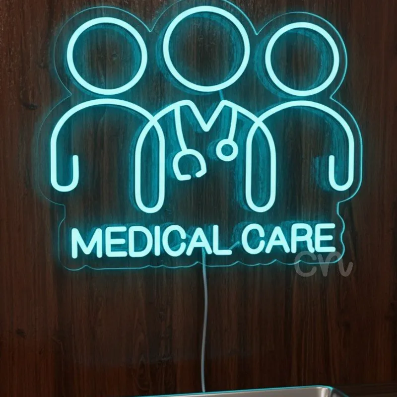 Professional 16x20 inch Medical Care neon sign featuring a doctor-and-team symbol with a stethoscope design. Perfect for healthcare professionals wanting to create a welcoming environment with modern décor that reassures patients.