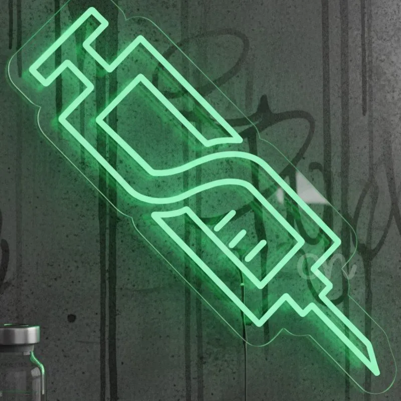 The Syringe Neon Sign (22x21 inches) is a bold, eye-catching LED wall light designed to represent precision, healthcare, and medical professionalism. Featuring a clean syringe outline illuminated with eco-friendly green LED tubing, this neon sign is perfect for hospitals, clinics, pharmacies, vaccination centers, and medical schools.Made from durable acrylic backing and flexible silicone tubing, it provides long-lasting brightness without the fragility of traditional glass neon signs. The sharp syringe design makes it a meaningful addition to vaccination rooms, immunization centers, or doctor’s offices, helping guide patients while creating a modern and professional healthcare atmosphere.This LED syringe sign is powered via USB, making it versatile and easy to set up in various locations. Its lightweight build ensures hassle-free installation, whether mounted on walls, displayed at reception desks, or placed in medical training centers.Engineered for energy efficiency, the sign consumes minimal power while offering a strong, vibrant glow suitable for continuous operation. With a lifespan of over 50,000 hours, it delivers reliability and performance, even in high-demand healthcare environments.Beyond practical use, the Syringe Neon Sign also makes a thoughtful gift for doctors, nurses, medical students, or healthcare professionals. It can be used for awareness campaigns, clinic decoration, or even as a unique centerpiece for health-related events.This LED sign blends symbolic meaning with functional illumination, making it an essential accessory for modern healthcare spaces.