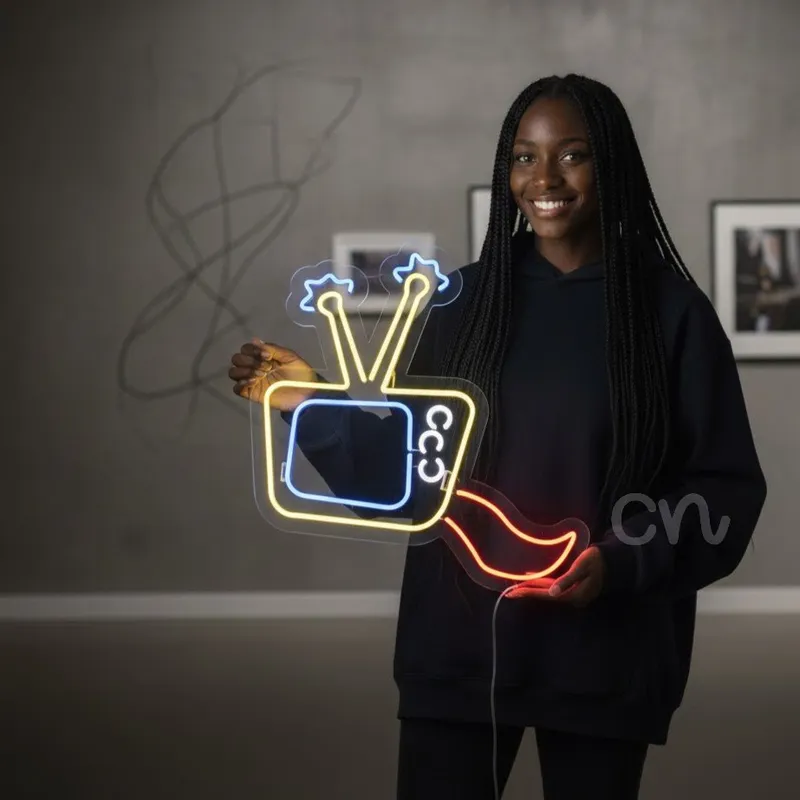 Add a splash of fun and personality to your walls with the 23x24 Fun TV Neon Sign, a colorful LED wall light that blends retro television nostalgia with playful, modern design. This neon sign features a quirky TV shape with dual antennas topped by star-like accents and a whimsical tail element, outlined in bright yellow, blue, and red neon flex tubing. The result is a one-of-a-kind decor piece that instantly transforms any space into a vibrant and inviting environment.Measuring 23x24 inches, this neon sign is the perfect size to serve as a centerpiece without overwhelming your wall decor. Its dynamic design makes it suitable for a wide variety of settings—whether you’re decorating a game room, kids’ bedroom, streaming studio, bar, cafe, or entertainment lounge, this sign brings a playful touch that will spark conversations and elevate the mood.Crafted with premium LED neon flex, this sign delivers all the glowing charm of vintage neon while being lightweight, energy-efficient, durable, and safe. Unlike traditional glass neon signs, it is shatterproof and cool to the touch, making it perfect for continuous use in both residential and commercial spaces. With a lifespan of up to 50,000 hours, this sign provides long-lasting brilliance without frequent maintenance.The vibrant multicolor glow creates a whimsical, cartoon-inspired vibe that appeals to all ages. It’s ideal for anyone looking to add character to their interior design, boost their streaming backdrop, or create a retro-futuristic ambiance in entertainment areas.This Fun TV Neon Sign is also an excellent gift idea for gamers, streamers, kids, retro enthusiasts, or anyone who enjoys unique wall art that combines style and light. With easy installation and a durable design, it’s ready to shine in your favorite space the moment you hang it.