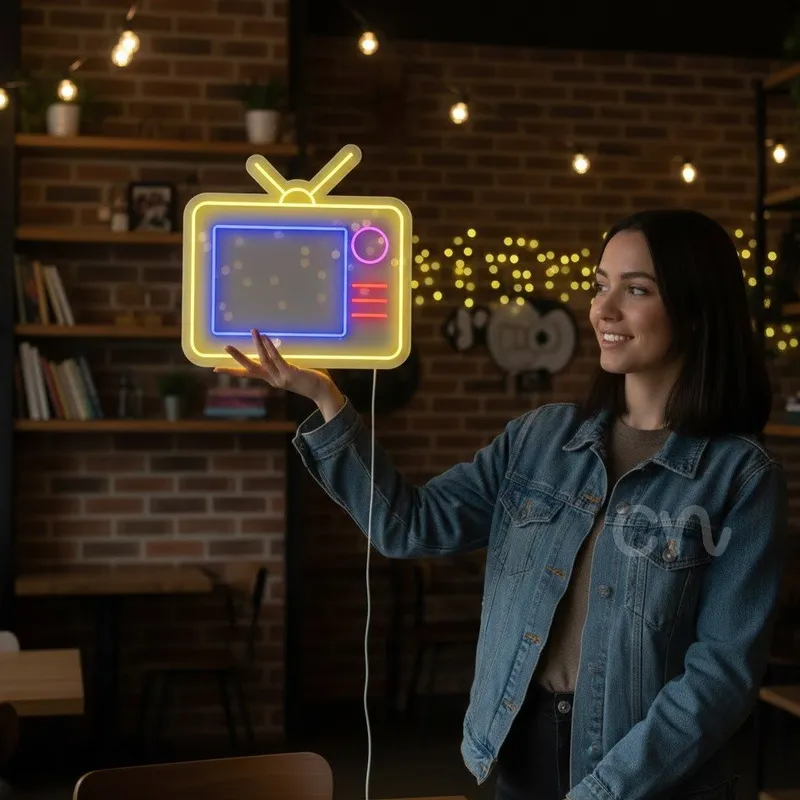 Retro TV Neon Design – Inspired by vintage televisions, complete with antennas, dials, and screen outline, this sign adds nostalgic charm and a playful retro vibe to any entertainment or creative space.