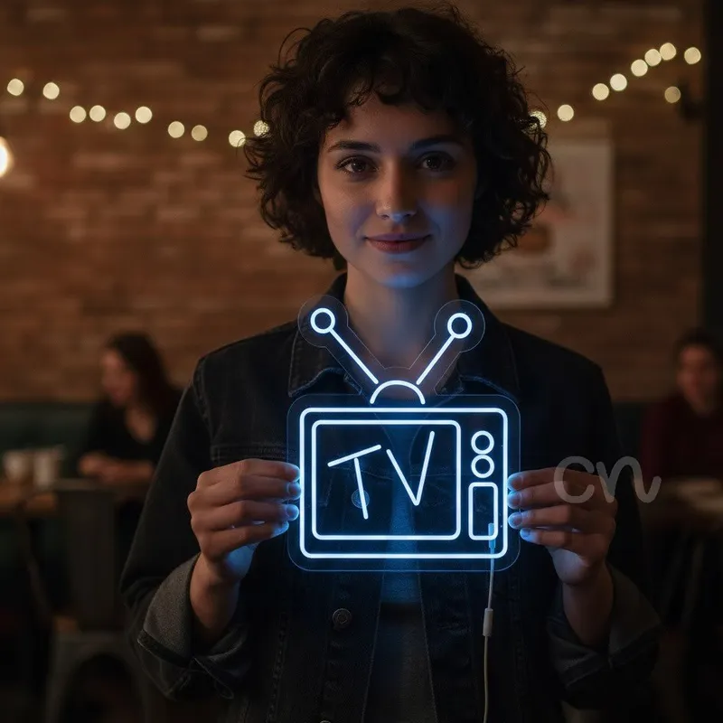 Retro TV Neon Design – Features a vintage television outline complete with antennas and bold “TV” lettering, glowing in brilliant blue for a nostalgic yet modern aesthetic.