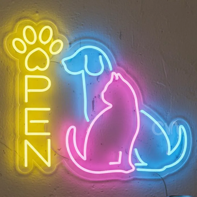 Vibrant LED neon design featuring a dog in blue, a cat in pink, and the word “OPEN” in glowing yellow with a paw print accent, creating a bright, inviting sign