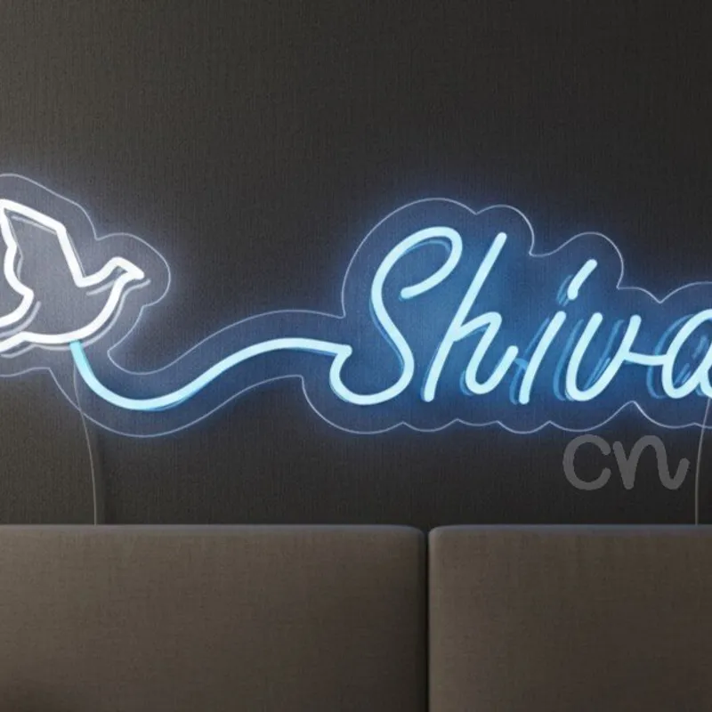 Personalized Name Neon Sign – Features the name “Shiva†in glowing blue script, accented with a white dove design symbolizing peace and harmony, making it a truly meaningful decorative piece.