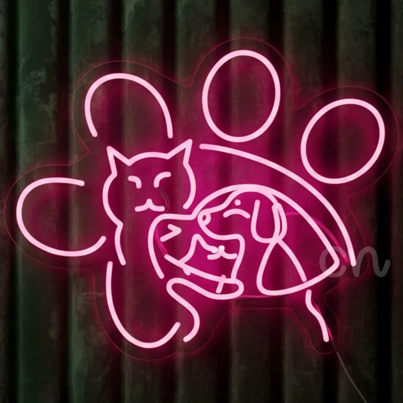 This neon sign features a paw print with cat and dog silhouettes inside, symbolizing love and care for pets. Its thoughtful design makes it an excellent decorative and professional signage choice for animal services.