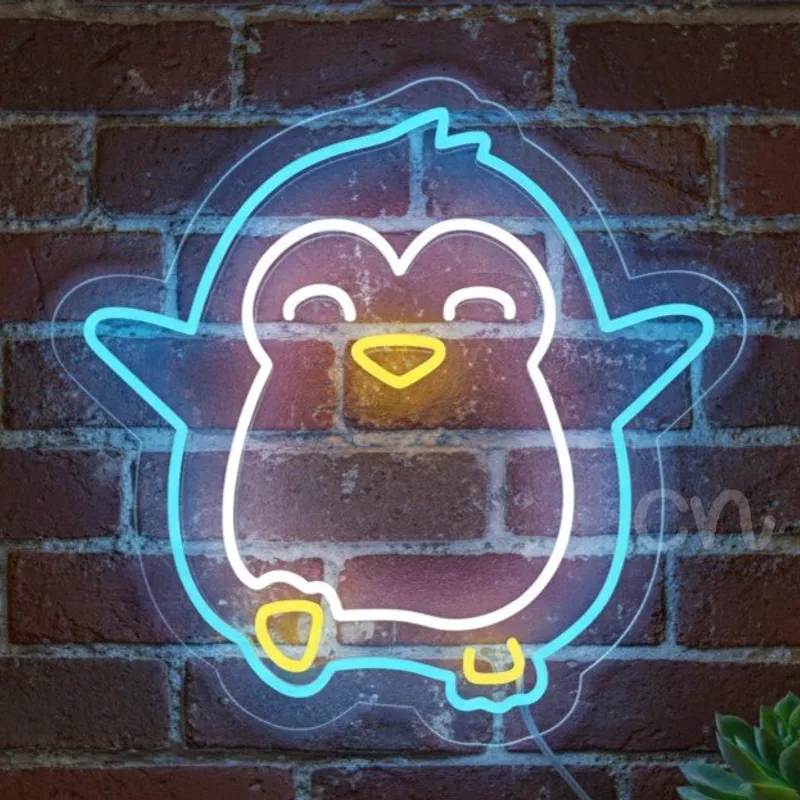 This custom cute penguin neon sign in 19x20 inches is designed with vibrant LED neon flex in blue, white, and yellow, creating an adorable glowing decor piece for any space. The penguin outline lights up with a playful expression, highlighted by white facial details and yellow beak and feet accents. Perfect as a nursery neon sign, kids room neon sign, gaming room light, or modern home decor accent, this LED neon flex sign brings joy and brightness wherever it is displayed. Its animal theme design makes it suitable for winter decor, birthday parties, children’s celebrations, and themed events.Crafted with LED neon flex, it delivers the look of traditional glass neon but with safer, more durable, and energy-efficient performance. The plug-and-play design ensures simple installation with a standard plug, eliminating the need for batteries or extra wiring. Mounted on a precision-cut acrylic backing, the sign is lightweight, stable, and easy to hang on any wall. The adorable penguin character with its cheerful glow becomes a fun centerpiece that sparks conversations and adds warmth to interiors. This neon wall decor doubles as both functional lighting and creative wall art. Its compact size makes it versatile for bedrooms, nurseries, cafes, or bars, offering flexibility as a permanent fixture or temporary event decoration. The vibrant blue outline enhances visibility, the white flex creates balance, and the yellow accents add personality. With LED neon technology, this sign consumes less power, ensuring cost-effectiveness while maintaining long-lasting brightness. It also makes a thoughtful personalized gift idea for kids, families, or animal lovers, fitting into a wide variety of decor themes. Whether used as home decor, nursery wall decor, gaming neon art, or as a lively party backdrop, this penguin neon light adds happiness and creativity.