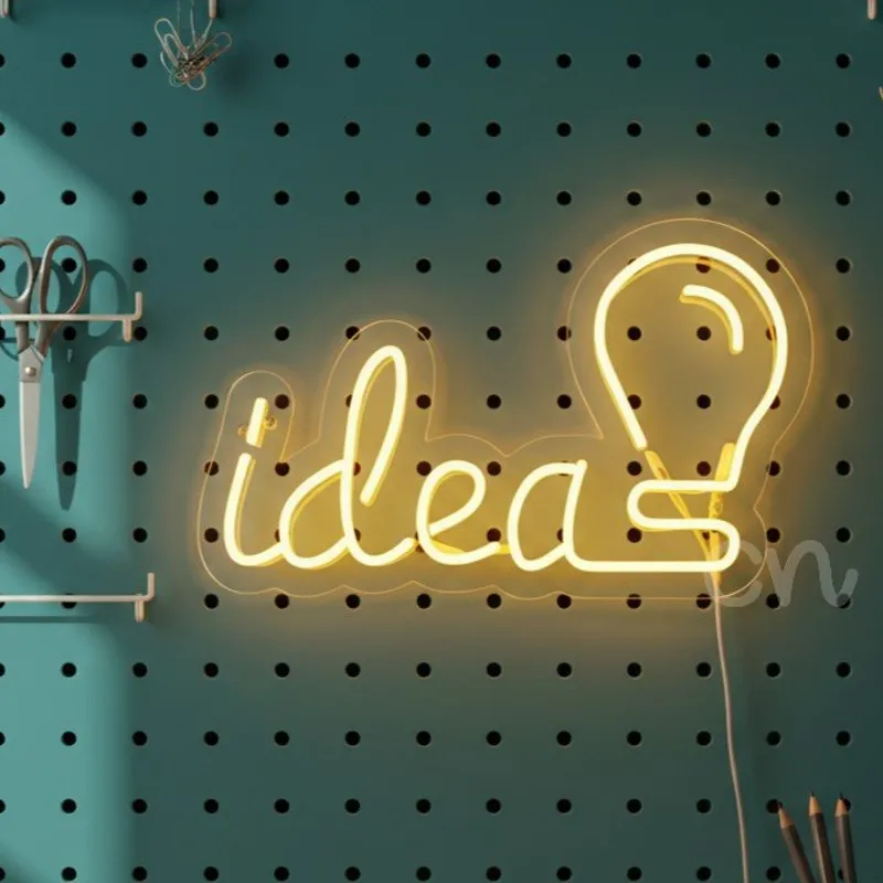 The LED neon idea sign delivers vibrant yellow illumination, making it ideal as idea neon desk sign or neon idea wall art for study areas, brainstorming rooms, and creative environments.