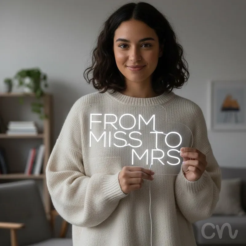 Celebrate your journey from Miss to Mrs with this stunning custom neon sign, crafted to add a touch of elegance to wedding preparations, bridal showers, or intimate home decor. The warm white neon glow creates a soft, inviting ambiance that harmonizes beautifully with romantic or celebratory themes. Available in a sleek 14x23 size, this handmade neon sign features safe silicone LED tubing and a premium transparent acrylic backing for a polished look. Perfect as a wedding or love sign decor, it easily elevates any space with its warm, eye-catching illumination. Designed for indoor use, it offers energy efficiency and a lifespan of over 50,000 hours. The included 12V adapter ensures simple setup—no batteries needed—while a 1-year warranty guarantees quality and durability. Whether as wall art lighting for the bridal suite or a personalized gift, this aesthetic room light adds a memorable, meaningful touch to special moments. Transform your space with a bespoke, handcrafted neon sign that celebrates love and new beginnings.
