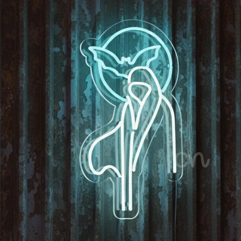 Illuminate your space with eerie charm using the 24x13 Neon Ghost with Bat Sign, a perfect fusion of spooky style and modern LED technology. This striking piece features a ghostly figure with haunting draped lines, accompanied by a bold bat silhouette perched above. Outlined in vibrant blue neon flex, the design creates an eye-catching glow that captures both the mystery of Halloween and the thrill of gothic-inspired decor.Measuring 24x13 inches, the compact yet impactful size makes it versatile enough to fit into home bars, living rooms, game areas, or commercial venues, while still delivering a commanding presence. The glowing bat and ghost combination makes it especially perfect for haunted houses, Halloween parties, or anyone who wants to embrace a chilling aesthetic year-round.Unlike fragile glass neon, this LED neon sign is crafted from flexible, shatterproof tubing that remains cool to the touch while providing long-lasting brightness. Mounted securely on a transparent acrylic backing, the design maintains its clean lines and ensures easy installation with pre-drilled holes for quick hanging.The sign is powered by energy-efficient LED technology that consumes far less electricity than traditional neon while delivering the same bold visual impact. It is safe for homes, eco-friendly, and built to last up to 50,000 hours, making it a reliable and cost-effective addition to your spooky collection.Whether you’re decorating for Halloween, designing a themed bar, or simply want to showcase your love for gothic and supernatural style, the 24x13 Neon Ghost with Bat Sign is a glowing statement piece that will enchant, spook, and impress anyone who sees it.