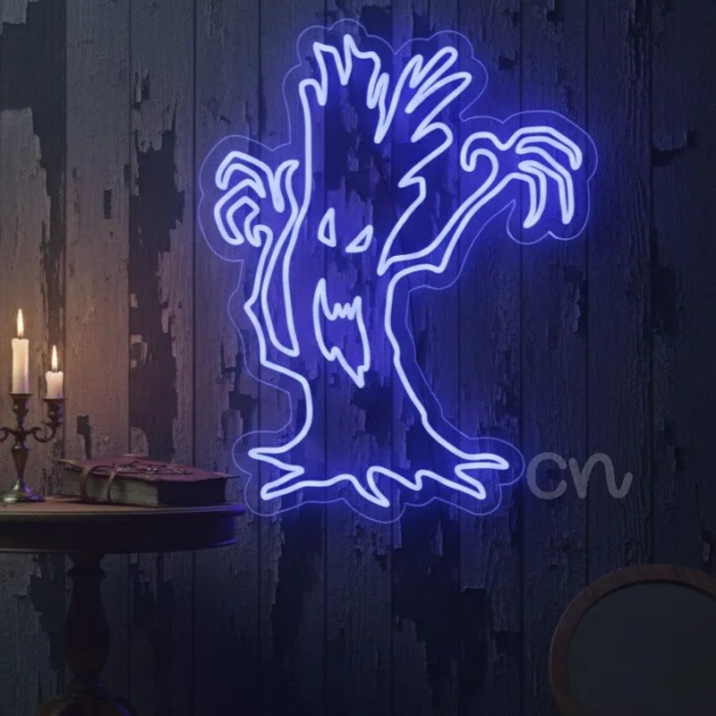 Bring a chilling woodland presence to your space with this 30x24 Haunted Tree Neon Sign, glowing in an eerie blue outline that transforms any room into a haunted forest. The twisted branches, sinister face, and jagged base design capture the essence of a ghostly tree come to life, making it an unforgettable piece of Halloween decor or gothic-inspired wall art.At 30x24 inches, this neon sign is impressively sized, large enough to make a dramatic statement while still fitting comfortably in living rooms, entryways, bars, or themed event venues. Its vivid blue LED glow enhances any atmosphere, whether you’re hosting a Halloween party, designing a haunted house walkthrough, or simply embracing spooky vibes all year round.Crafted with premium LED neon flex on a durable acrylic backboard, this haunted tree sign provides the same bold brightness of classic neon without the fragility of glass. It’s energy-efficient, long-lasting, and safe to touch—making it suitable for homes with kids, pets, or high-traffic areas. The sign is also lightweight and easy to mount, thanks to pre-drilled holes and included hardware.This eerie neon artwork isn’t limited to Halloween. Its gothic aesthetic makes it a year-round piece for alternative home decor, studios, or bars. Imagine it glowing as a centerpiece above a gaming setup, adding spooky flair to a photo booth backdrop, or creating a chilling vibe in a dimly lit lounge.Whether as a striking decoration for your own space or a unique gift for someone who loves Halloween, creepy decor, or neon art, this Haunted Tree Neon Sign delivers atmosphere, personality, and haunting style. It’s more than a light—it’s an experience that brings stories of haunted woods and eerie nights into your home.