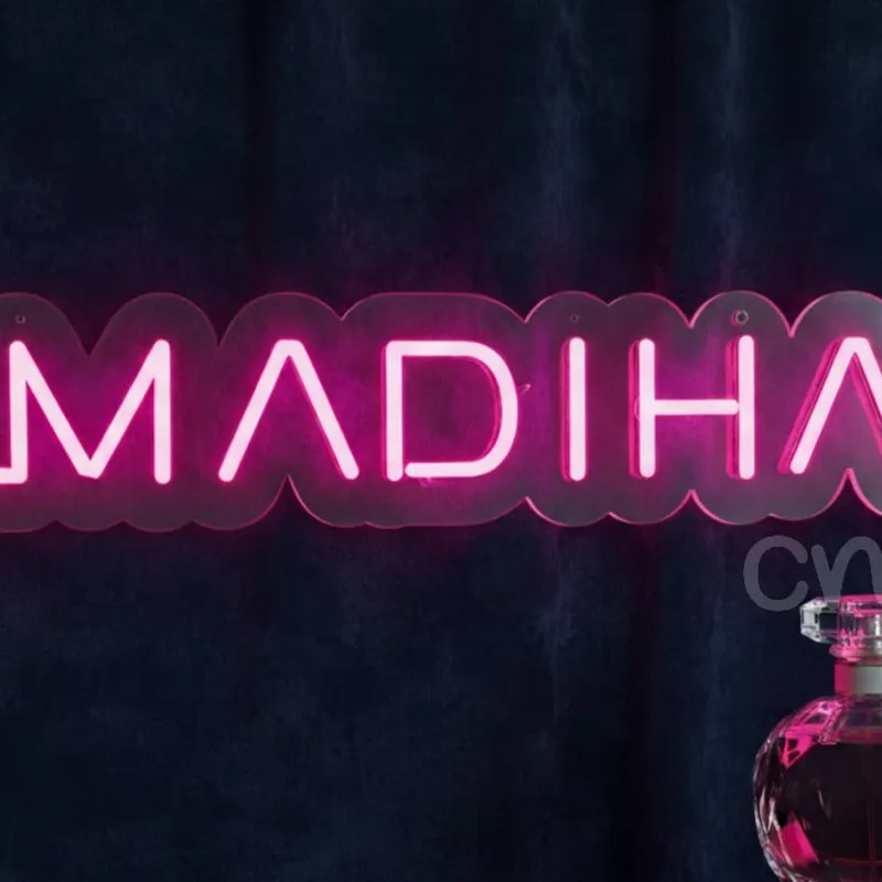The MADIHA custom name neon sign is a vibrant and stylish decor solution, perfect for adding a personalized touch to any environment. Displaying the name “MADIHA†in a bold, all-capital font, the sign glows beautifully in bright pink, creating a striking statement piece. Measuring 5x23, it is slim and wide, making it ideal for use as a wall-mounted feature in bedrooms, boutiques, studios, or event backdrops. The luminous pink color offers strong visibility and a warm, contemporary ambiance that elevates any setting. Designed with energy-efficient LED tubing, the sign replicates the nostalgic glow of traditional neon while ensuring safety, durability, and low energy consumption. Its lightweight build and smooth cut backing make installation simple, whether mounted permanently or used as a portable event decor element. This sign serves as a versatile option, from personal gifting to interior styling, offering both function and character. With its minimal yet impactful design, the MADIHA neon sign is well-suited for anyone seeking a personalized piece that blends modern aesthetics with reliable performance. Durable LED construction ensures long-lasting brightness without the fragility of glass neon, making it a practical and decorative choice. Whether as a centerpiece in a bedroom, an accent in a shop, or a highlight at an event, this neon sign provides charm, personalization, and enduring glow.