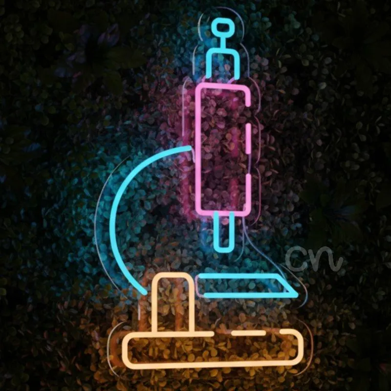 Unique microscope neon sign illuminated in blue, pink, and orange LED lighting captures the universal symbol of science and discovery, making it a bold and inspiring centerpiece for classrooms, labs, or modern home interiors.