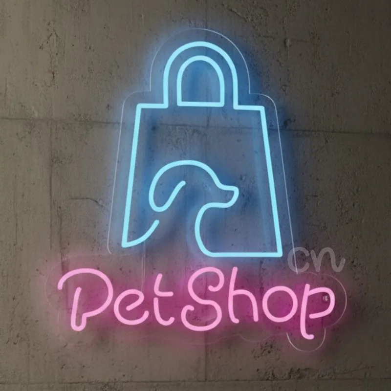 Show your love for pets and attract more customers with the 23x22 Inch Pet Shop Neon Sign, a vibrant and modern LED light designed to stand out. Featuring a blue neon shopping bag with a dog silhouette inside and stylish pink “PetShop†lettering, this sign is perfect for any pet-focused business looking to increase visibility and create a welcoming environment.Made from durable LED neon flex tubing, this sign replicates the warm glow of traditional glass neon without the downsides. It is shatterproof, lightweight, energy-efficient, and safe to touch, making it ideal for busy shops, grooming salons, veterinary clinics, and pet cafes.The 23x22 inch size makes this sign a bold centerpiece for storefront windows, entryways, or interior displays. The contrasting blue and pink colors ensure maximum visibility, helping your store shine day and night. Whether you’re on a bustling street or inside a shopping complex, this sign will make your shop instantly recognizable to pet lovers.With a lifespan of over 50,000 hours, this LED neon sign provides long-term illumination while consuming minimal electricity, reducing both costs and environmental impact. Mounted on a clear acrylic backing with pre-drilled holes, it’s easy to install and relocate whenever needed.Perfect for pet supply shops, veterinary practices, grooming salons, animal shelters, and pet adoption centers, this sign doesn’t just advertise your services—it helps build a friendly and trustworthy brand identity. It also makes an excellent gift for new pet shop owners or animal lovers starting their own business.Upgrade your storefront with this Pet Shop Neon Sign and watch your business attract more attention, more smiles, and more loyal customers.