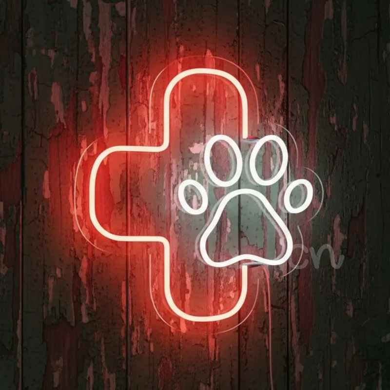 This veterinary neon sign features a bold medical cross with a paw print design, making it instantly recognizable to pet owners. Its professional look draws attention while promoting trust and compassion for animal care.